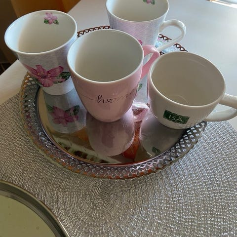 3kpl kahvikuppeja. 2kpl astioita pieneen tarjoiluun, esim sokerikko. Samaa sarjaa kuin mitä minulla on myynnissä omina kohteinaan. Kupit kaikki kerralla 8e, tarjoiluastiat 6e, kupit ja tarjoiluastiat yhdessä ostettuna 10e