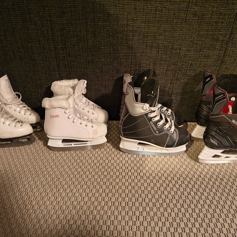 Ok kuntoiset luistimet, jonkin verran käytönjälkeä joka näkyy kuvissa, ok terävät. Kokomerkintää ei ole, mutta pohjallisen sisämitta 19,5cm.
