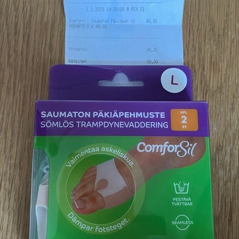 Myydään vähän käytetyt ja tarpeettomaksi jääneet Comforsil -merkkiset päkiäpehmusteet varvaslenkeillä, jotka on hyväksytty CE-merkinnällä lääkinnälliseksi laiteeksi. Päkiäpehmusteet toimivat tehokkaana iskunvaimentajana auttaen suojaamaan päkiää liialliselta paineelta ja kuormitukselta. Lisäksi ne autavat ehkäisemään hiertymien ja kovettumien muodostumista. Päkiäpehmusteiden reunat ovat ohennettu, joiden ansiosta ne eivät paina jalkoja ja pysyvät paikoillaan kankaalla vahvistettujen varvaslenkkien ansiosta. Päkiäpehmusteet sopivat kaikenkokoisille jaloille ja ovat huomaamattomia ihonvärisen silikonin ansiosta ollen samalla myös hajuttomia. Päkiäpehmusteet on pesty aina käytön jälkeen ja ovat siten käyttövalmiina ja puhtaina uutta käyttöä varten. Mukaan alkuperäinen tuotepakkaus sisältäen suomen- ja ruotsinkielisen tuotetiedot ja käyttöohjeet.
