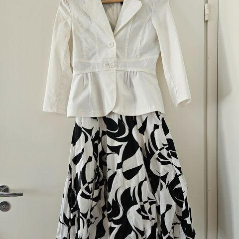 Kerran käytetty jakku ja housut. Hame käyttämätön. Jakussa lyhyet hiat.