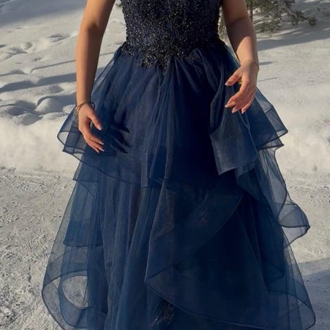 Zazabellasta ostettu kaunis tummansininen Dazzling mekko, jolla tanssittu yhdet vanhat. Edessä paljetteja. Takana nyöritys sekä vetoketju. Tanssittu vannehameen kanssa.