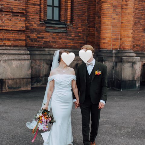 Huippusuunnittelija Monique Lhuillierin suunnittelema pitsinen applikoitu hääpuku, jossa avoin selkä, illuusiopääntie ja irrotettava tyllilaahus