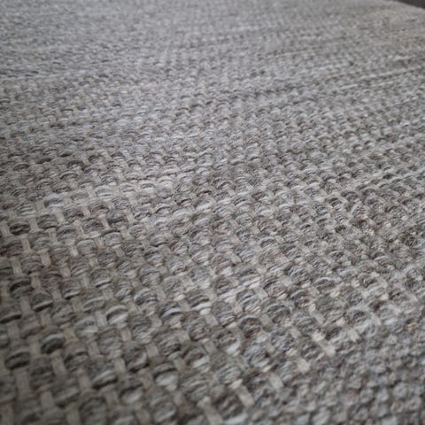 Kuvioitu harmaa-valkoinen villamatto.