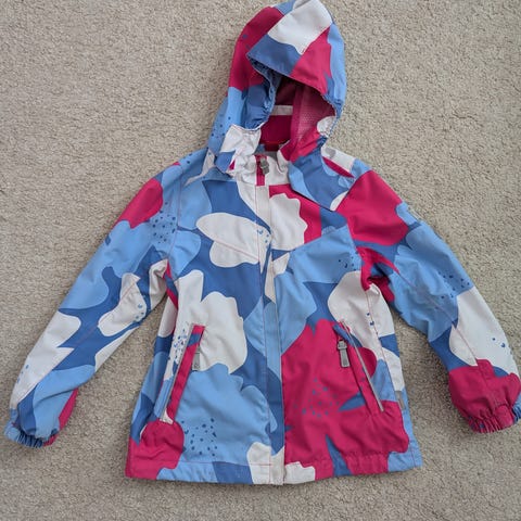 Myydään Reimatecin välikausitakki, jossa kulumaa hihansuissa ja helmassa sekä värjäymää vaaleimmissa kohdissa. Näitä ei ole yritetty poistaa tahranpoistoaineella.