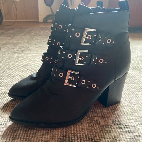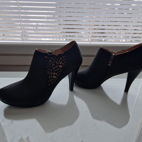 Myydään pari kertaa käytetyt mustat Hispanitas nilkkurit, koko 40. Kaunista pintakuvioitua nahkaa. Korko 7 cm. Kaupan päälle tulee varakorkolaput.