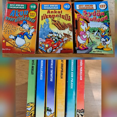 Aku Ankan Taskukirjoja 157 kpl. Tähtihetket 1-4, Super 1 ja 6, Taskukirjat n:rot 1,26,74,92,101,104,108,145,150,155,216,304,338,339,342-410,412-429,431-441,443,446,454,459,500,513,518. Teema numerot 21-22,29,31,33-40,2x42,45,48,51,52. Sudenpentujen käsikirja 2 ja 8 kpl muita. Kaikki yhteishintaan 150 euroa (alle euron kpl)