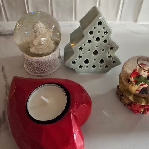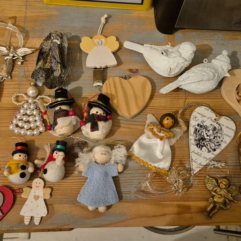 Joulutavaroita ja -koristeita: kynttilänjalka x3, tuikkulyhty x2, joulutabletti x2, pannunalunen x2, kuusenkoristeita x8, ovikoriste x2, puinen pyykkipoika x6, savihahmot x2, korurasia