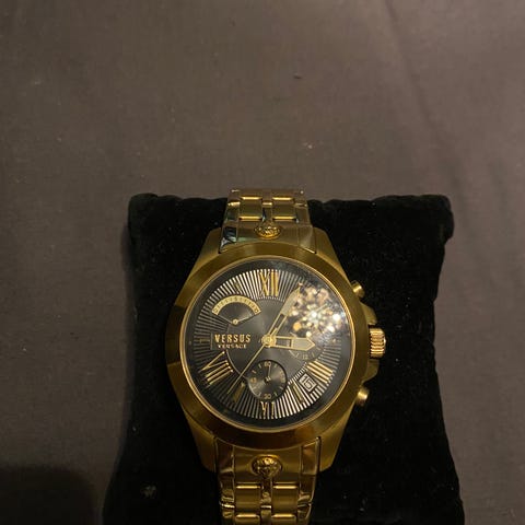 Versace Greca Time GMT Quartz Watch 41mm. Kello ok kunnossa, hieman naarmuja ja iän tuomaa kulumaa. Kellon ovh nykyään n. 1000e. Tullut minulle perinnön mukana. Alkuperäistä boksia ei enään löydy. Kello ostettu ~2019. Tällä hetkellä kellosta myös patterit loppu. Suoraan käytöstä jäänyt ylimääräiseksi. Itsellä ei käyttöä, kun kelloja jo valmiiksi muutama.