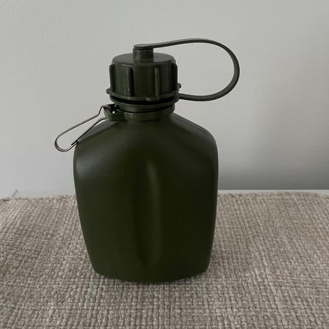 Myydään hyväkuntoinen muovinen juomapullo kaulanauhalla. Vetoisuus 0,4 l. Korkeus noin 17 cm. Korkki aukeaa napista painamalla ja siitä tulee esiin juomapilli. Kierrettävä kansi pullossa.