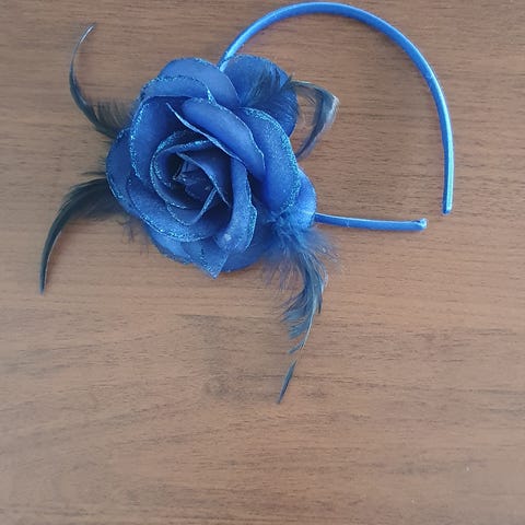 Ruusukoristeinen panta. Ruusun halkaisija enimmillään noin 6 cm. Kumilangan ympärysmitta täysin ilman venytystä noin 18 cm, joustaa hyvin. Kunto uutta vastaava.