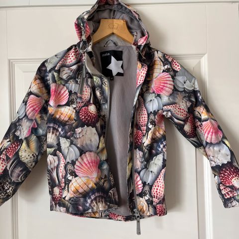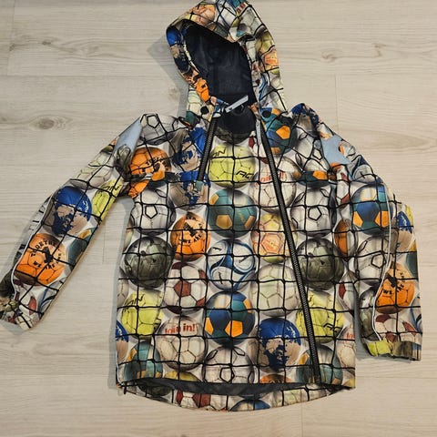 Hyväkuntoinen Molon takki koossa 128 cm. Menee pienemmällekin käyttäjälle, hihassa resorit. Vyötäröllä kiristysnauha, irroitettava huppu, heijastintähtiä. Napilliset taskut.