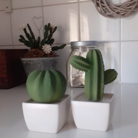 Muoviset koriste kaktukset ruukuissa, molemmat yhteensä 5€ , korkeus 13-16 cm halkaisija noin 8 cm