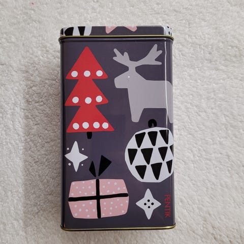 Metallinen n. 15 cm korkea Pentikin purkki, jota kiertää jouluinen possukuvio. Ehjä ja puhdas.