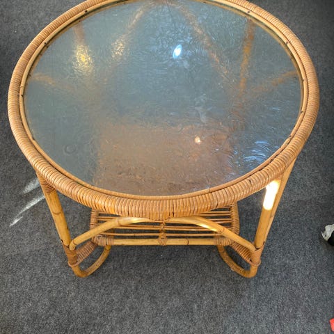 Näyttävä ja suuri riikinkukkotuoli, rottinkia. Vanha kaunotar, joka on maalattu joskus vaalealla värillä. Täysin ehjä, mutta iän tuomaa kulumaa maalissa.