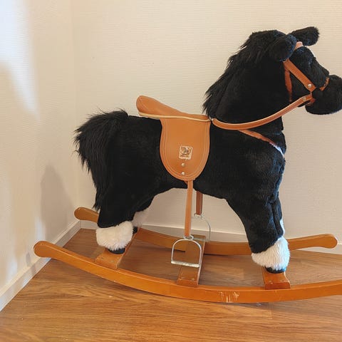 Mamas & Papas merkkinen lasten keinuhevonen. Oikeasta korvasta painamalla niin hirnuntaa ja kopotikop-ääntä. Istumakorkeus n. 32cm. Pari pienempää tahraa ja normaalia köytön jälkeä, muuten hyvässä kunnossa.