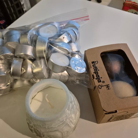 Lisäksi toinen samanlainen iso pöytäkynttilä, sinivihreä