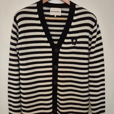 Marimekon mustavalkoinen Sif tasaraita neuletakki 80% villaa, 20% polyamidia. Ollut vain pari kertaa päällä.