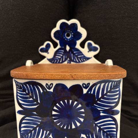 Arabian Köökki-sarjan sininen suolasalkkari ja lusikka. Gunvor Olin-Grönqvist signeeraus. Korkeus 15 cm, leveys 13 cm ja syvyys 8,5 cm. Lusikka 9 x 4 cm. Ehjä ja siisti.