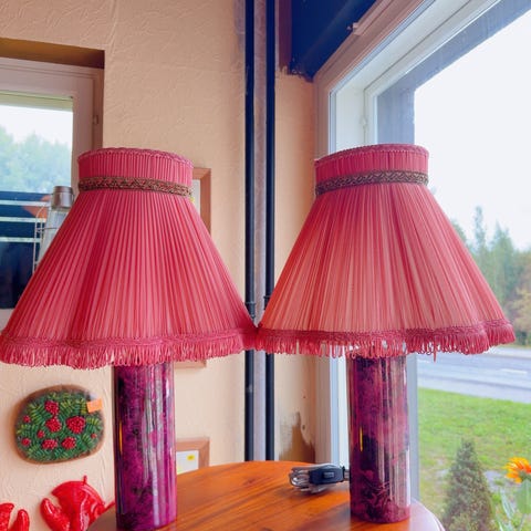 Kotimaiset 1960 luvun pöytävalaisimet 2 kpl lasi-messinki valaisintehdas Sario