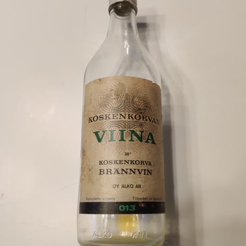 Myynnissä kuvan tyhjä 1,5 l Koskenkorva pullo. Pullo on ns juhlamalli, pullossa kohokuvioiset tekstit ja kuvio.