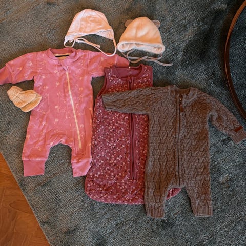 Settiä on mahdollista upgreidata erikseen myynnissä olevilla /myyntiin tulevalla merinovillahaalarilla (pinkki koko 62 cm, beige villasekoitehaalari 60cm tai valkea merinohaalari kääntöhihoilla ja -lahkeilla 68/74cm) . Toppahaalaria mahdollista vaihtaa isompaan (68/74cm harmaa, valkeasävyinen ja beige). Merinovillakypärämyssy tummansininen ja merinosilkkikypärämyssy maleerattu viininpunainen. Lisäksi löytyy paljon sisävaatteita tyttö-poika-unisex alkaen koosta 50cm.