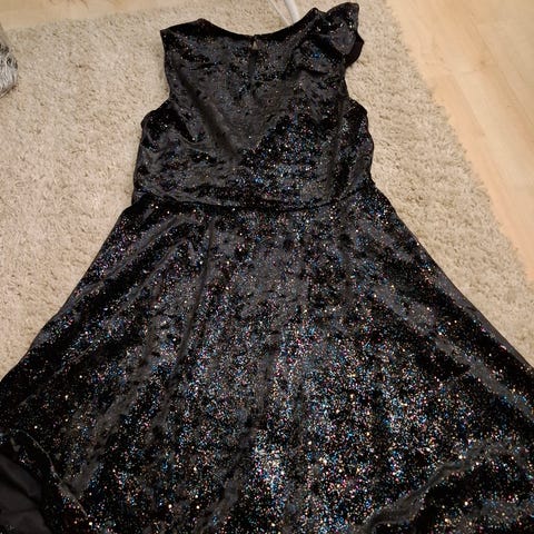 Kaunis juhlamekko: alhaalta mustaa ”samettia” ja yläosa hopeinen juhlava kimalle