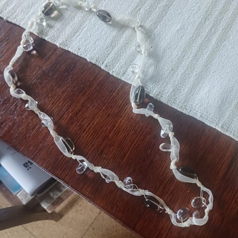 Kaunis kaulanauha punottu helmistä ja lasihelmistä. Pituus 53cm. Iso helmi 2×2,5cm