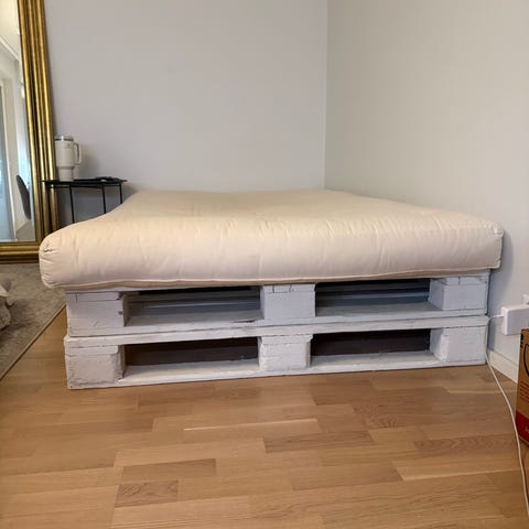 Teräksinen Innovationin futonpatjan runko 140x200 cm patjalle. Runko 50mm mustaksi maalattua teräsputkea, joten erittäin tukeva. Menee 4 osaan kuvien mukaisesti. Huom! runko on 139x198 sisämitoiltaan, joten sopii pehmeille patjoille. Mukaan saa halutessaan myös sälerungon, jossa 3 säleen kiinnikkeet ovat rikki. Säleet saa mukaan. Sälerunko 138x197cm ja siinä on myös keskipalkkiin tukijalka. Säleet kiinitetty 2-tappisilla kiinnikkelillä teräksiseen runkoon. Ei tietoa käyvätkö vakiokiinnikkeet varaosiksi. Vain nouto Turusta.