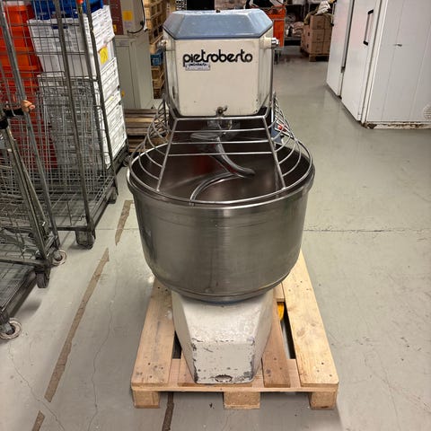 Iso ja painava taikinakone / yleiskone suurkeittiöön, vuosimalli 1990. Mukana taikinakoukku ja mela. Astian tilavuus n. 15 litraa. Hinta alv 0 %.