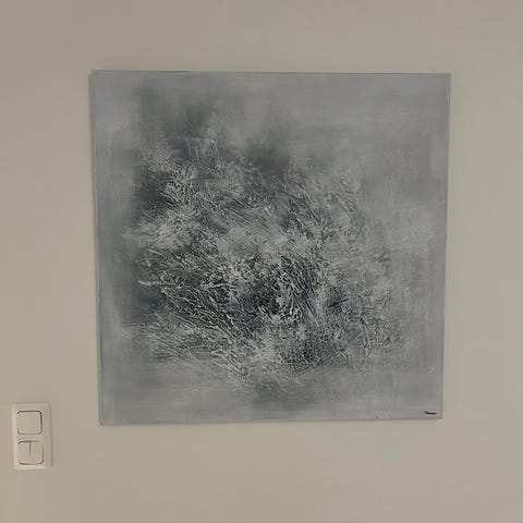 Oma pieni abstrakti työ nimeltä Kerrassaan, 2024. Guassit ja vesiliukoiset puuvärit. Koko 20 x 15 cm ja kehyksineen 25,5 x 20,5 cm.