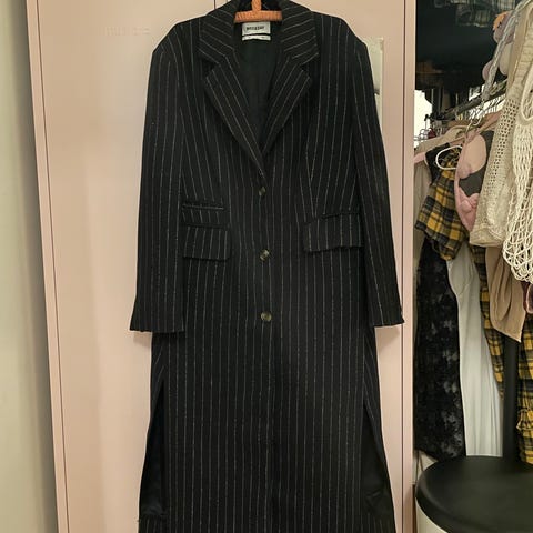 Ruosteenpunainen, nilkkapituinen villakangastakki, Clif (uutta villaa, casmiria, polyakryylia) koko 34-36, tekoturkiskaulus ja hihansuut