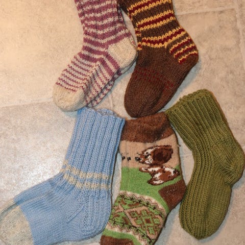 Kahdet pohjalaisvillasukat. Pienempien sukkaosan mitta 20cm ja isompien 23cm. Isompia ei juurikaan ole käytetty, pienemmät myös hyväkuntoiset. 10e/pari yhdessä 15e.