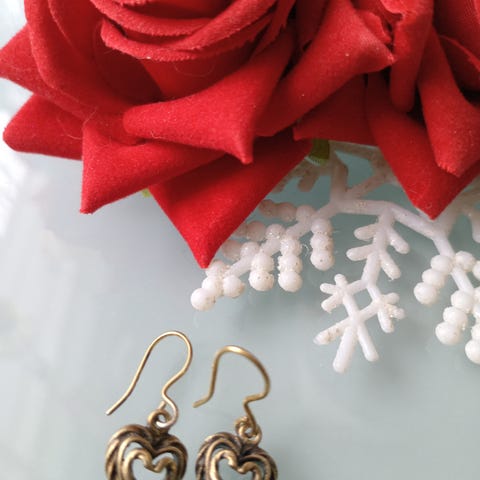 Pronssinen Kalevala Korun Talon sydän korusetti, mihin kuuluu kaulakoru, roikkuvat korvakorut sekä rintakoru.