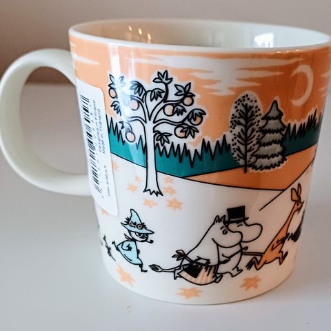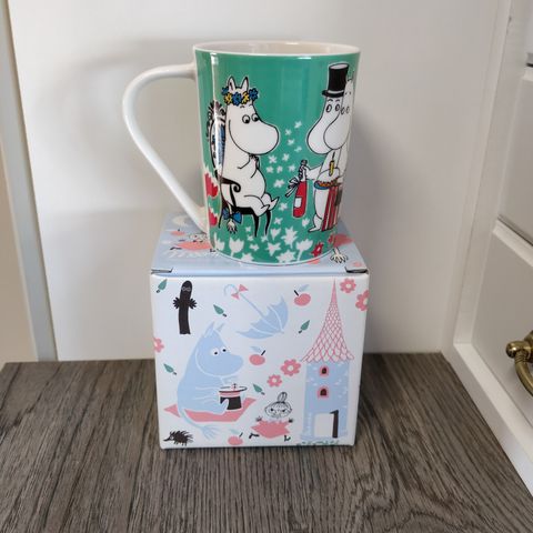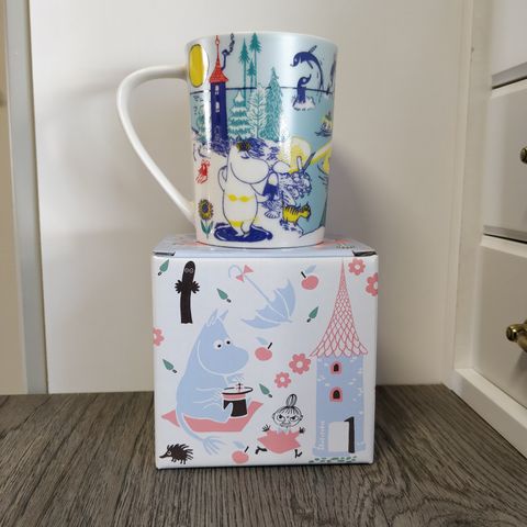Mukin sisäpuolella teksti "the story of moominvalley". Sama teksti löytyy myös pohjasta, samoin yamaka.