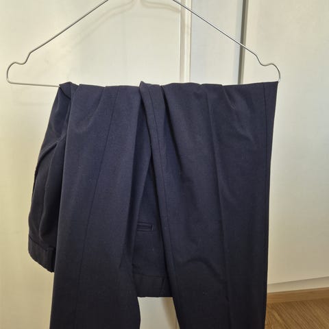 Miesten musta puku, jossa hennot liituraidat. Sankar Men's fashion mallistosta. Viskoosi /polyester. Jakku pidempään mallia. Koko hoikka B50.