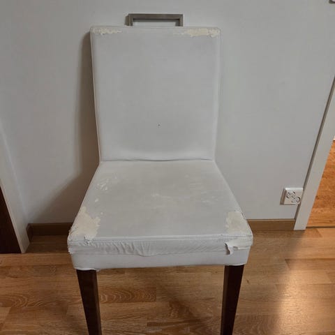 Keinonahkatuolit keittiöön. Pinta kulunut kuvan osoittamalla tavalla. Muuten ehjät. Säilytetty aina sisällä.