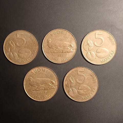 5 kpl 5 markan kolikoita. 1992 v Saimaan norppa