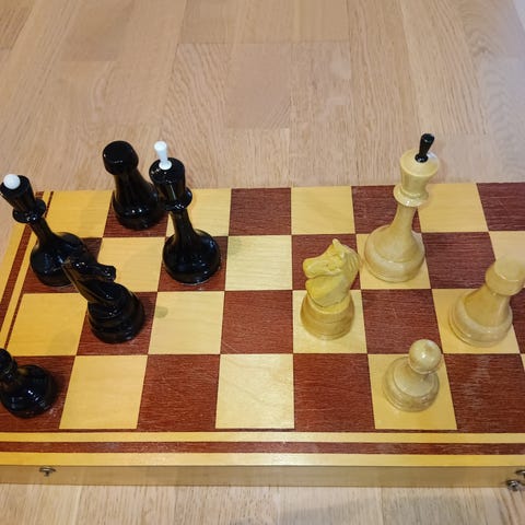 Kristallisin shakkinappuloin. Hyväkuntoinen. Pelin alla oleva pieni pöytä seuraa mukana.