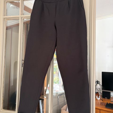 Naisten mustat suorat joustavaa kangasta olevat housut, joissa edessä tikkaukset. Koko S.