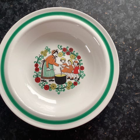 Arabian lasten lautanen 1960-luvulta, suunnitellut Raija Uosikkinen, korkeus 3,5 cm ja halkaisija 19,5 cm. Hyväkuntoinen, lasitteessa on vähäisiä käytönjälkiä ja puuropadassa pieni naarmu, kuten kuvastakin näkyy.