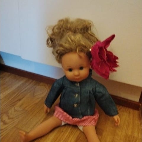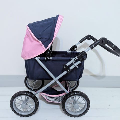 Kuvan mukainen nukke vaunuilla ja hoitotarvikkeilla.