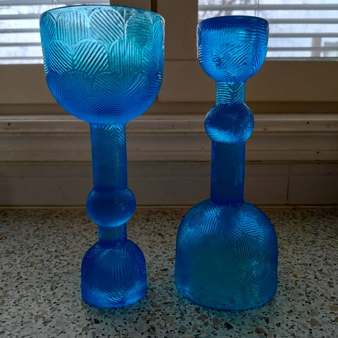 Kaksi koboltinsinistä ehjää Nuutajärven lasin kynttilänjalkaa.