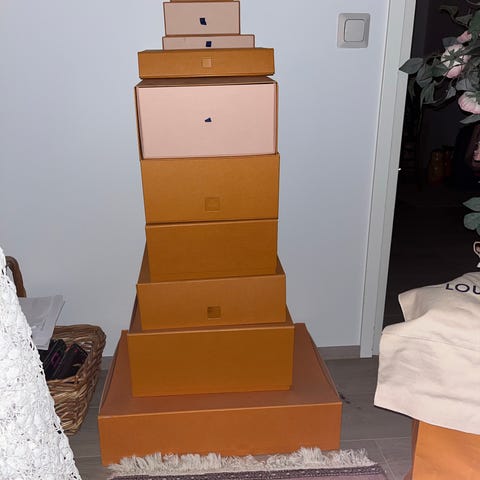 Lois Vuitton setti ja sisältää kirjan ja 3 dustbagiä Isompi leveys 22cm ja korkeus 35 cm ja 2kpl pienet leveys 18 cm ja korkeus 35 cm.hinta koko setillä.