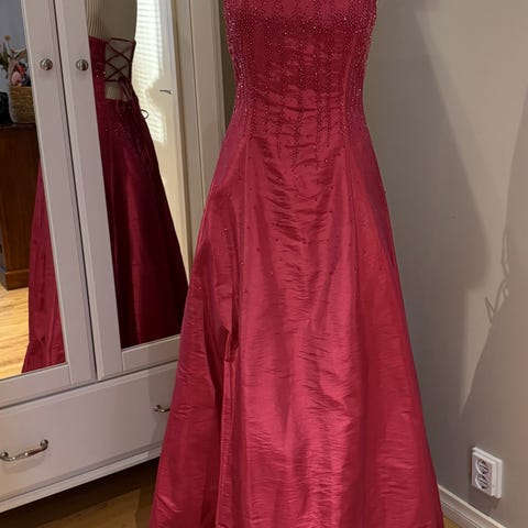 Hyvässä kunnossa oleva vanhojentanssimekko / juhlamekko / iltapuku. Vera Mont -merkkinen. Ei ole kertaakaan tanssittu, koska mekko on minulle liian iso. Se on ollut vain kaapissa. Väriltään punainen, mutta kangas näyttää myös mustalta tietystä kulmasta katsottuna. Mekon alareunassa on kerros punaista ja mustaa tylliä. Koko 40. Voi silittää. Malliltaan muistuttaa 90-luvun mekkoa, vaikka moderni onkin.