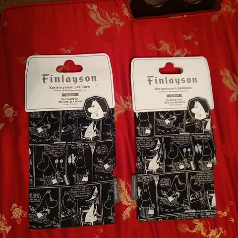 Hyväkuntoinen ja pirteän punainen Muumi-aiheinen tyyny. Päällinen on pesty.