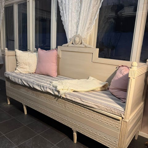 1) Kustavilainen puuosiltaan kullattu ja gobeliinikankaalla verhoiltu pienehkö "ammesohva" ANTIIKKIA. Puuosat taidokkaasti veistetyt, kultaus kulunut, jousituksen satulavyöt alhaalta reunoista lauenneet, mutta jousitus muuten kunnossa. Päälliset uusittava, ellei halua pitää wanhaa alkuperäistä gobeliinipäällistä. Verhoilutyö ja kultauksen paikkaus helppo, selkäosa ja istuin yksinkertaiset. Hinta tällaisenaan 600e.