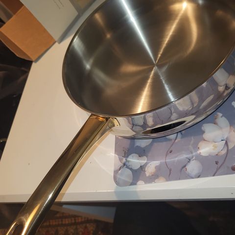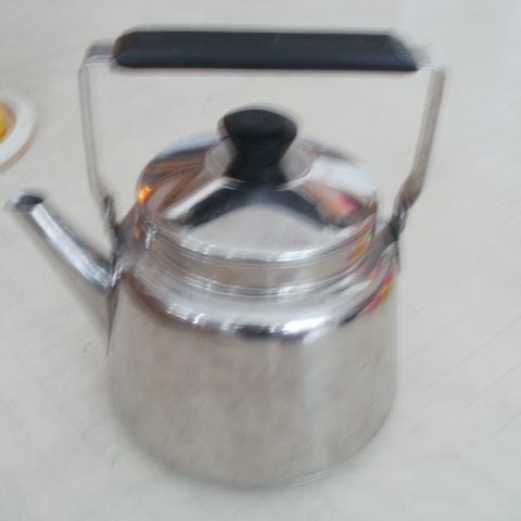Arviolta ainakin 0.5 L vetoinen kevyt metallinen pannu. Pinnassa hiukan patinaa. Saranat kunnossa. Pannua on käytetty teen ja kahvin tarjoiluun sekä koriste-esineenä. Itämainen, Lähi-Idästä kotoisin.