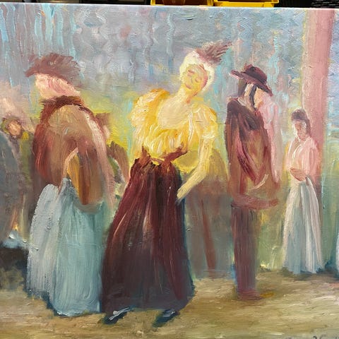 -Taiteilija on edesmennyt mummoni, joka maalasi harrastuksenaan ja piti myös useita näyttelyitä. Minulla on hänen taulujaan useampia ja voit kysellä myös eri kokoisia tai eri värisävyillä olevia.