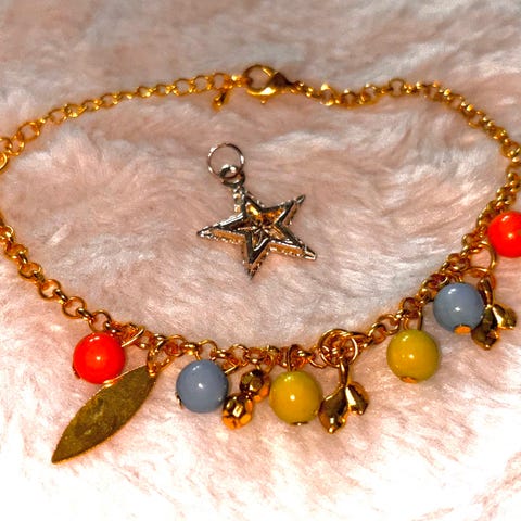 Mustaan ja valkoiseen nauhaan pujotettu ja kiinnitetty eri kokoisia ja välisiä luukoristeita. Kaulanauhan pituus 55 cm. Nauha menee pään läpi ilman irroittamista kiinnikkeistään.