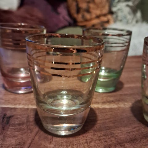 Kauniisti kuvioitu, korkeus 10 cm, halkaisija 4 cm. Harvinaiset snapsilasit. Hinta koko setille.